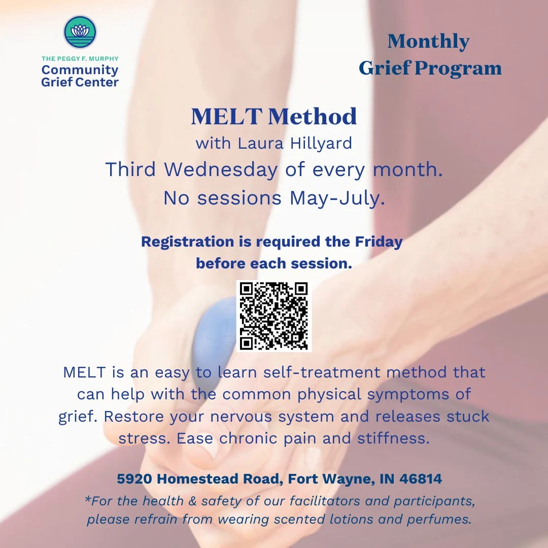 MELT is an easy to learn self-treatment method that can help with the common physical symptoms of grief. Restore your nervous system and releases stuck stress. Ease chronic pain and stiffness.**For the health & safety of our facilitators and participants, ...
