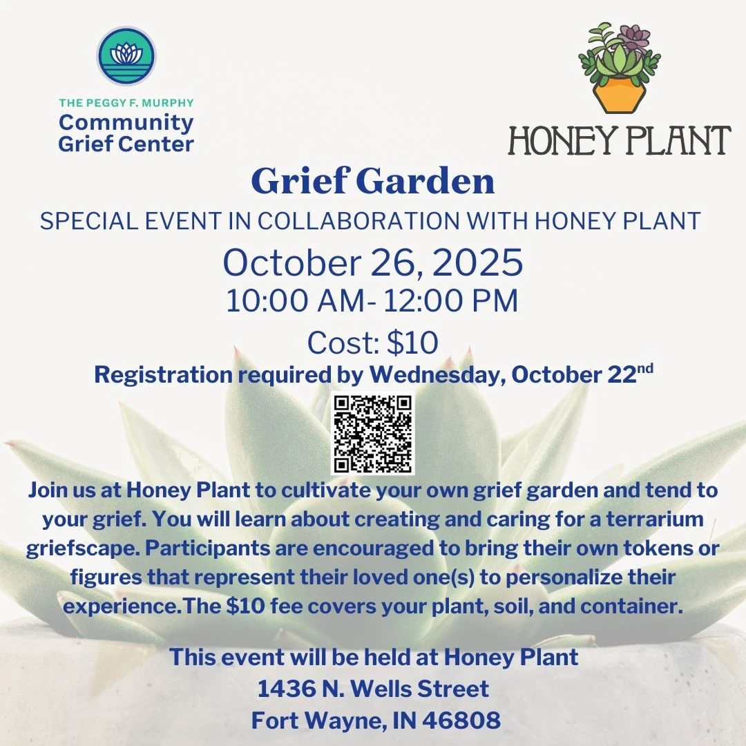 Join us at Honey Plant to cultivate your own grief garden and tend to your grief. You will learn about creating and caring for a terrarium griefscape. Participants are encouraged to bring their own tokens or figures that represent their loved one(s) to personalize their experience. The $10 fee covers your plant, soil, and container. ...