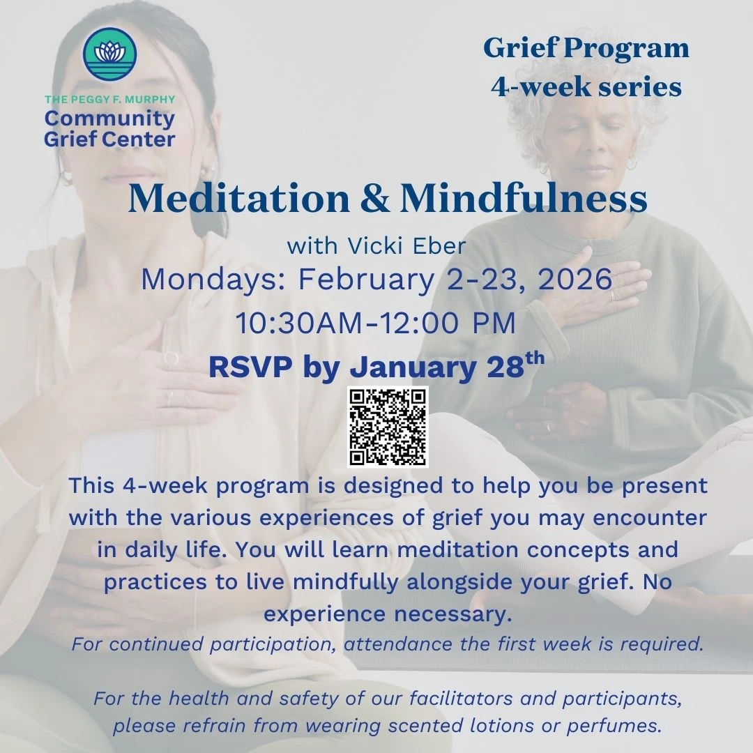 This program is designed to help you be present with the various experiences of grief you may encounter in daily life. You will learn meditation concepts and practices to live mindfully alongside your grief. No experience necessary. Click here to complete the required registration by January 28th.