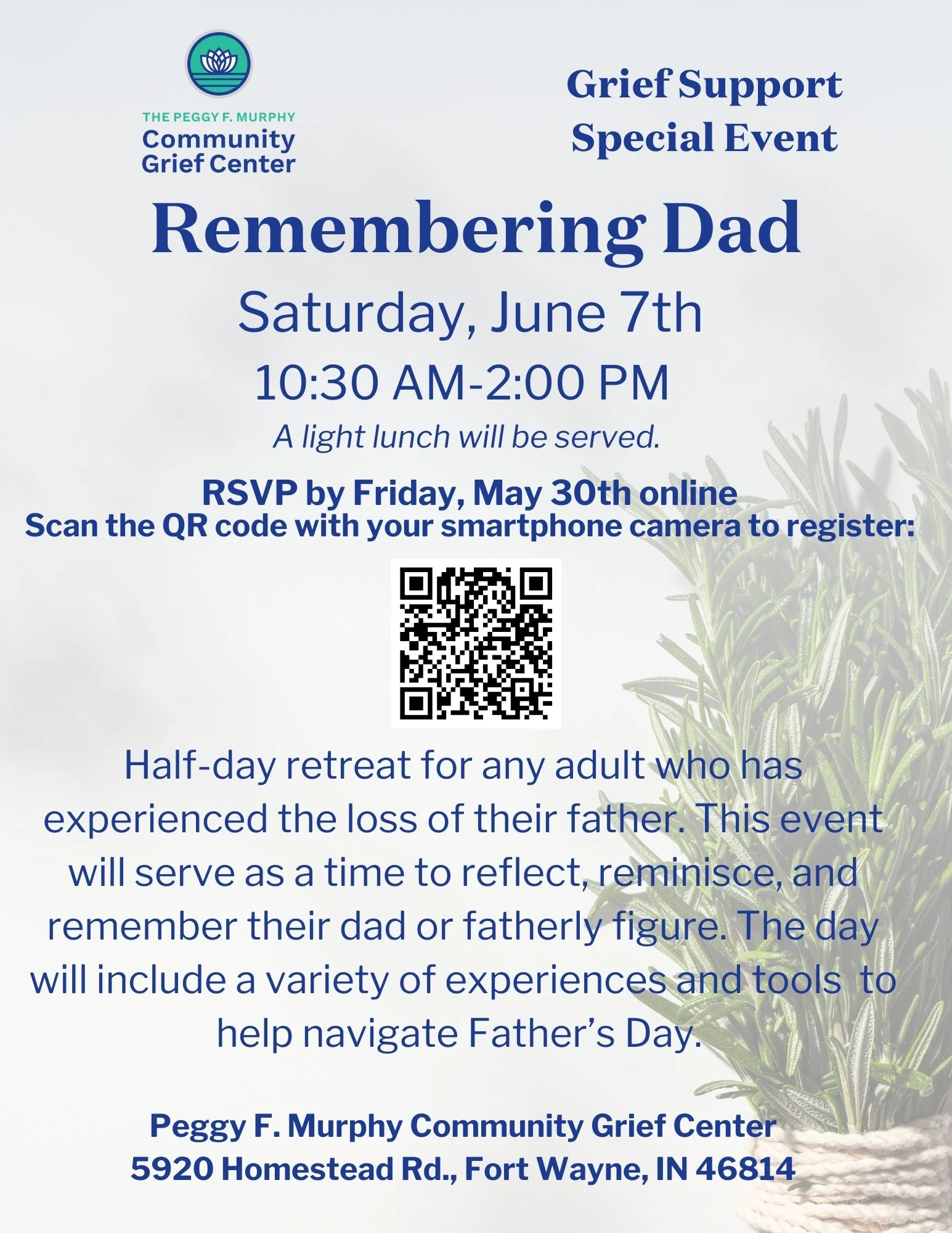 Half-day retreat for any adult who has experienced the loss of their father. This event will serve as a time to reflect, reminisce, and remember their father or fatherly figure. The day will include a variety of experiences and tools to help navigate Father’s Day. A light lunch will be served. Registration is required by May 30th.