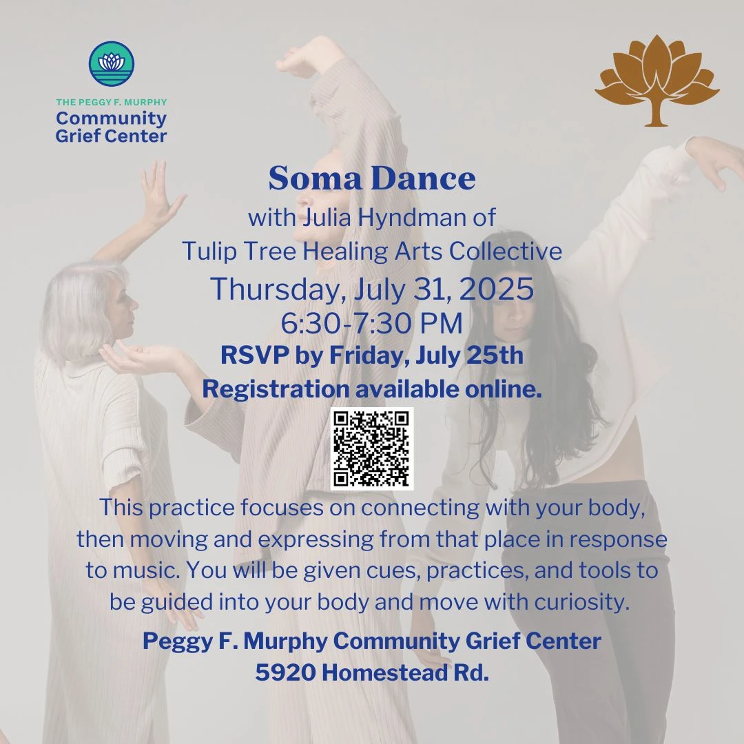 The practice of somatic dance focuses on connecting with your body, then moving and expressing from that place in response to music. You will be given cues, practices, and tools to be guided into your body and move with curiosity. Click here: RSVP required by July 25th