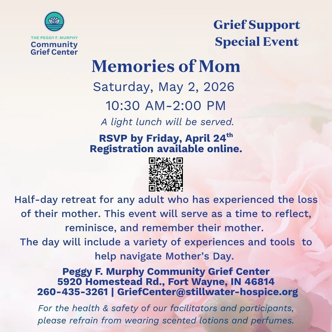 The Peggy F. Murphy Community Grief Center 5920 Homestead Road, Fort. Wayne, INAfter the death of a spouse or significant other. 1st & 3rd Thursday of each month. Please call 260-435-3261 or email [email protected] to complete the required registration the week prior to each meeting date.